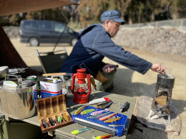 キャンプ大好き、軍物大好き、アイアン・メイデン大好きなRED中村氏。そしてもちろん、何よりシーバス釣りが大好き。そもそも独り遊びが得意で、海外のバックパッカー経験もあるタフでマイペースなTHE 男キャラ。そんな彼が有名シーバス系ルアーブランドから独立したのは9年前。同僚2人でスタートした「ポジドライブガレージ」とは、独特なプロダクトと独自なペースで既にシーバスファンより認知されている尖ったルアーブランド。偶然にもローバイト発行人と彼は、元仕事場や地元まで重なる奇遇な関係。会話もお酒も弾み、彼が好むキャンプスタイルで笑いが絶えない楽しい時間を過ごした。