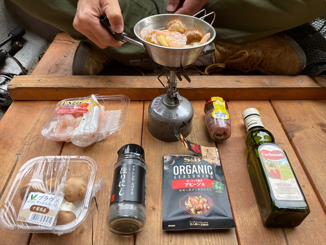オリーブオイル、アンチョビ、むきえび、マッシュルーム、アヒージョの素、そしてアフター技としてポテチ(ピザポテト)を備える。シェラカップにぶち込みバーナーで簡単アヒージョを目指す。現場提供は弁慶橋ボート場(TEL/03-3238-0012)。