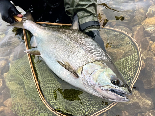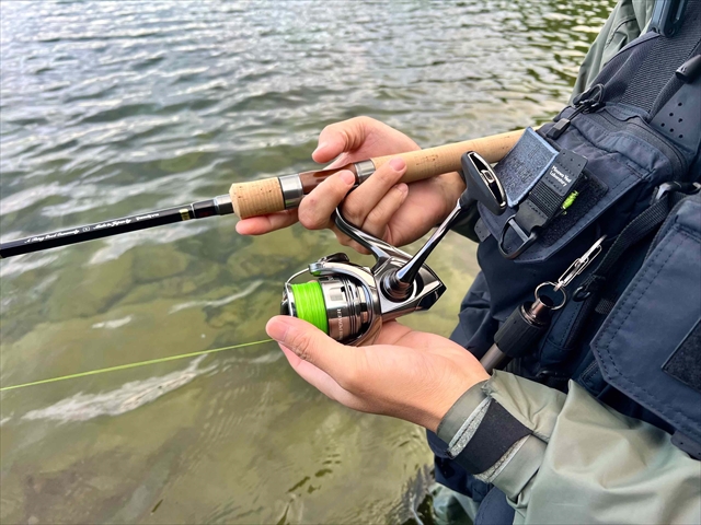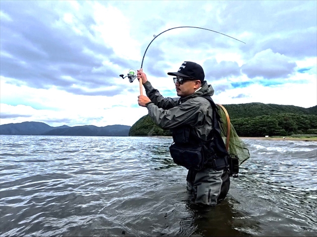 美しいトラウトを求め、はるばる新潟県から福島県猪苗代湖に通う本間さん。普段はシーバスフィッシングをメインに活躍中だが、彼が密かに心を寄せているのが猪苗代湖のトラウト達だ。しかし冬は禁漁期間と豪雪で湖面に近づけなく、夏は水温上昇で魚はルアーが届かない深場へ移動してしまったり、止むを得ず狙うシーズンは春と秋に限られてしまう。従って魚と出会える確率は決して高くないが、磐梯山の風景を眺めながら、楽しい仲間と過ごし、神々しい魚体を思い浮かべると、新潟県から福島県の遠征も全く苦にならないようだ。そして2025年春は見事なサクラマスを仕留めることが出来た。ジグを100m前後遠投。ボトムを叩きながらルアーを縦にシャクリ上げ再び沈める。そして食わせが期待出来るブレイクポイントを越えて、ルアーがシャローに差し掛かったところでトゥイッチアクションをかけながらリーリングしていると…、一気に「ゴツン!」とリールのハンドルが止められた。衝撃的なバイトに驚かされた興奮の一匹。これぞ、貴重な!立派な!猪苗代湖産サクラマスだったそうだ。