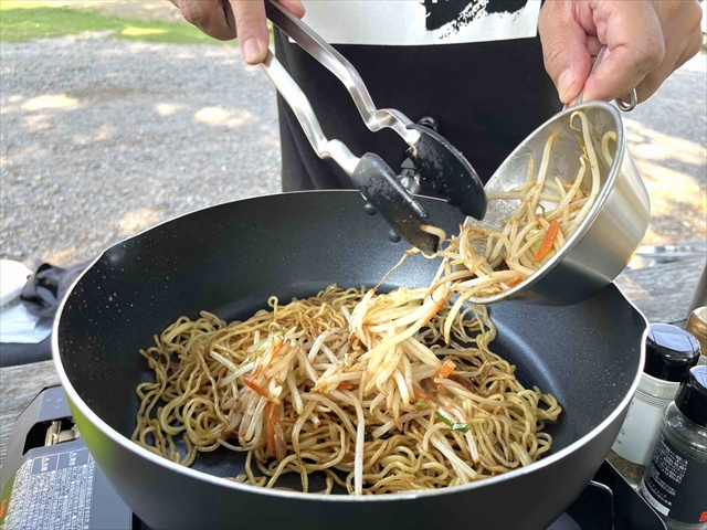 3:改めて麺と味付け済みの野菜を合わせて炒めていく。すると、麺に張りが出て香ばしい味が生まれる。