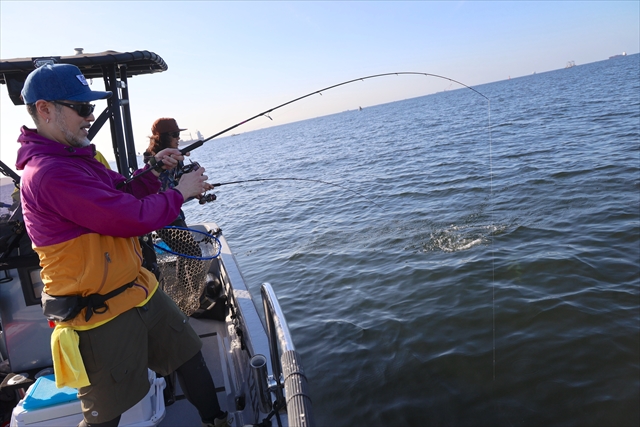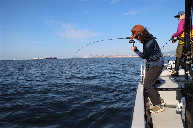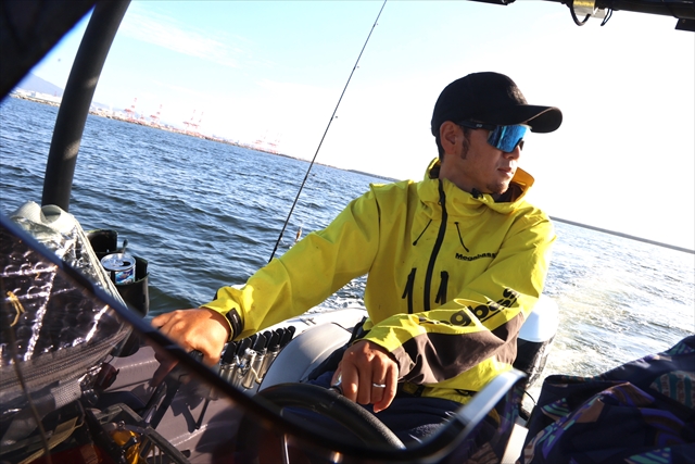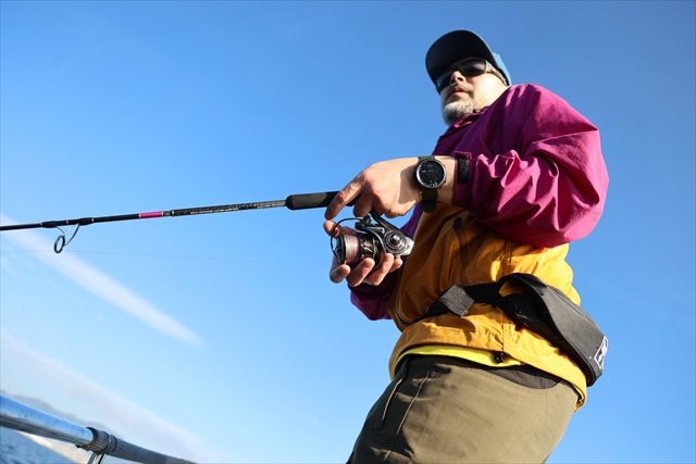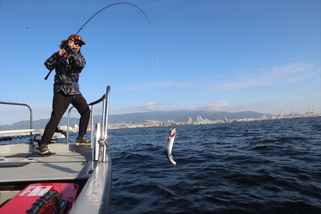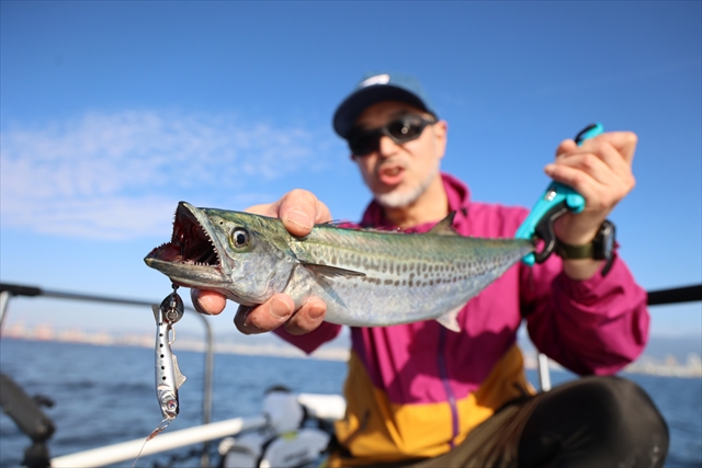 とてもとても暑かった夏がまだ記憶に残る2025年の秋。大阪湾ではイワシの群れを追いかけて出生魚のサゴシが釣れ出していた。40~50cmはサゴシ、50~60cmはヤナギ、70~80cmはサワラと呼ばれ、基本的にルアーを遠投して底まで沈めたら「煙が出そうな勢いでリールを巻け!」というシンプルでアクティブな釣り方だ。ポイントまで船を走らせること20分くらい。船長の指示でルアーを投げていると、早速反応があった。全速力で巻いているリールがガツンと一瞬止まったら、魚がフックに乗ったサイン。決して慌てず魚の重みを感じながら魚を寄せてキャッチ。少し緊張していた吉野くん顔が少し綻んだ。ヒットルアーはブレイドジグのXESTA/EBIRAN 40g(KSHカラー)。ルアー後部に付いたブレイドがキラキラとクルクル回って魚を誘い、それを目掛けてサゴシが高速直球ですっ飛んでくるようだ。船の上では息が上がる作業だが、休むことなく一定のスピードでルアーを巻いてくると、噛み付きながらルアーに何度もアタックし、そのうちブレイド付近にあるシングルフックが口を捉えフッキングに至る。魚の重みを感じても竿を立てる(アワセる)ことなくリーリングを止めないことが重要だ。またジグヘッドの重みがシングルフックに乗っていないとフックアウトしてしまうので、テションを緩めることなく魚の重みを竿に程良く乗せながらファイトを楽しんでもらいたい。船縁に魚が近づくと急に突っ込んだりもするが、CATAPULT LIGHTのバットパワーが魚の勢いをしっかり受け止めてくれた。