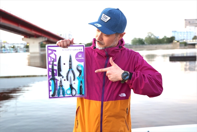 普段より回遊している青物はファイト後も船上で必ず暴れる。外れたルアーや血飛沫が飛んできたりするので万全な注意が必要だ。見ての通り、歯が鋭く魚の口から針を外す時は素手厳禁。必ずプライヤーを使い、しっかりと魚が弱ってから作業に取り掛かろう。そして鮮度を保ち美味しくいただくために、ナイフで脳を締め死後硬直を極端に遅らせる。エラからハサミを入れ、体内から血を抜くことによって身の劣化と生臭さを防ぐ。青物釣りには知っておきたい知識の一つだ。そこで今日の釣りにピッタリ!手にしているのは「KAHARA JAPNA/KJ マルチツールキットⅡ」。釣り場で使い勝手の良い5つのツールをピック。ギザ刃付きでPEラインの切れ味が抜群な「PEラインシザース」。極小スプリットリングの交換も便利でギザ刃付きの「4.7インチマイクロティップステンレスプライヤー」。テフロン加工で錆に強く専用カバーも付いた「9.8インチテフロンナイフ」。キャッチした魚をロックし、水中に落下しても浮いてくれる「プラグリップ」。テフロン加工でタングステンカッターも付いて、スプリットリングの交換も便利な「7インチテフロンコートプライヤー」。マルッと税別\4800にて発売中。