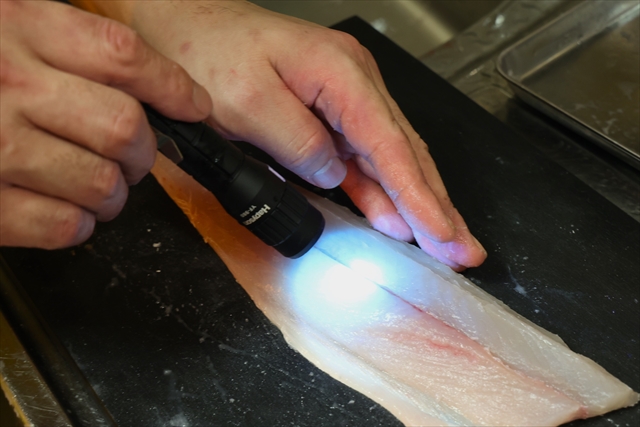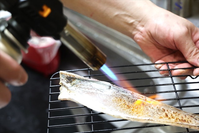 料理人として経験値を重ねる吉野くんは、バンド経験もあるシーバスやショアジギングも好む大阪在住ソルトフィッシャー。お気に入りの音楽を聴きながら包丁捌きは進む。淡白で身が柔らかいサゴシを手際良く三枚におろし、紫外線LEDライトでアニサキをチェック(今回は寄生虫の発見は無かった)。バーナーで炙ったり味付けをして煮込んだり、お刺身を筆頭に煮付けや竜田揚げというお料理が並んだ。可愛い食器に盛られ、見事に味の棲み分けがされたサゴシフェスのようだ。これぞ嬉しいアフターパーティー!釣りというレジャーを楽しみ、お食事という形で生き物の命をいただいた。感謝します。