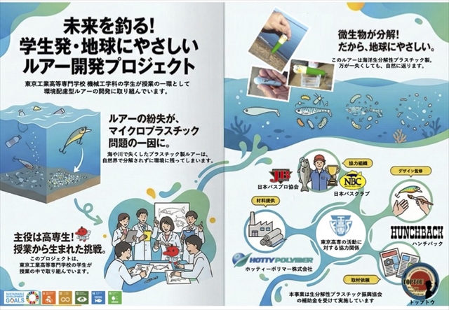 海や川て?失くしたフ?ラスチック製ルアーは、自然界て?分解されす?環境に残ってしまい、マイクロプラスチック問題の一因に繋がってしまう。不本意だが我々フィッシャーが水中にルアーロストしないか?と問われれば答えはNOだ。水中の根掛かりや、糸が切れてしまうラインブレイクなど、出来ることなら我々も避けたいトラブルが山ほどある。フィッシャー側からすると、高価なルアーや大切なルアーが無くなってしまうのは悲しい事件だ。しかし自然界からすると、それは迷惑に他ならない不要な置き土産だ。もちろん、全てのフィッシャーがそれを避けたいと思っていると信じたいし、後ろめたい気持ちで釣り場に立つフィッシャーだって少なくないはず。そこに注目して立ち上がったのが、東京工業高等専門学生の皆さんだ。東京工業高等専門学校(機械工学科)の学生が授業の一環として、環境配慮型ルアーの開発に取り組んでいる。それは微生物が分解してくれる海洋生分解性プラスチックのルアーで、万が一失くしても自然に返ってくれる「地球に優しいルアー」だそうだ。この姿勢に様々な方面からサポートの手が上がった。材料を提供してくださる「ホッティーポリマー株式会社」や、日本バスプロ協会まで応援してくれているようだ。今回はデザインの監修を務めるルアービルダー「HUNCHBACK」の中務さんと、生徒を束ねる白土先生に詳しいお話を聞いてみた。